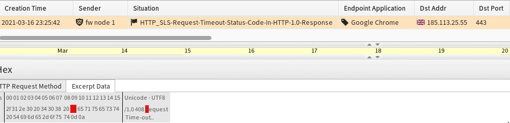 The Chrome browser has opened a TLS connection to a server, but after the TLS connection has been established, the client has not sent any data. At a certain point, the server gets bored and wants to close the unused connection to free up room for someone with actual needs. So they decide to send a “408 Request Timeout” reply to the client. But what do we see here?! They use HTTP/1.0 as the version! “408 Request Timeout” is only a valid response code in version 1.1! That is a bit like saying that your favorite character in The Fellowship of the Ring is Éowyn. Yeah, she is cool, but she is not introduced until in The Two Towers!