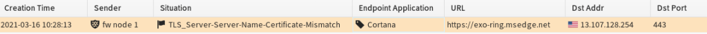 This one is another success for Microsoft, Cortana this time. Again, this one happened in the background. Cortana initiates a TLS connection to a legitimate Microsoft IP, using the domain name “exo-ring.msedge.net”. But what do you know – the certificate for this server has nothing to do with exo-ring.msedge.net, instead it lists these domains as legitimate domain names: