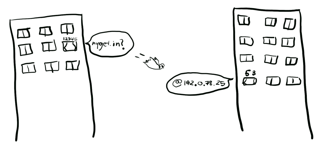 On the application layer, the DNS client sent a request asking where “nyget.in” is located at, and the server replied with the IP address of nyget.in. In this example we saw one benefit of UDP, which is the minimal amount of packets that were needed for the information to get across. We had the pigeon fly once to the server to deliver the query, and then back to deliver the response. If the same was done with TCP, there would have been many more packets flying, as there would have first been a need for the 3-way handshake, then the transfer of the query and response, and then the connection would have to have been closed.