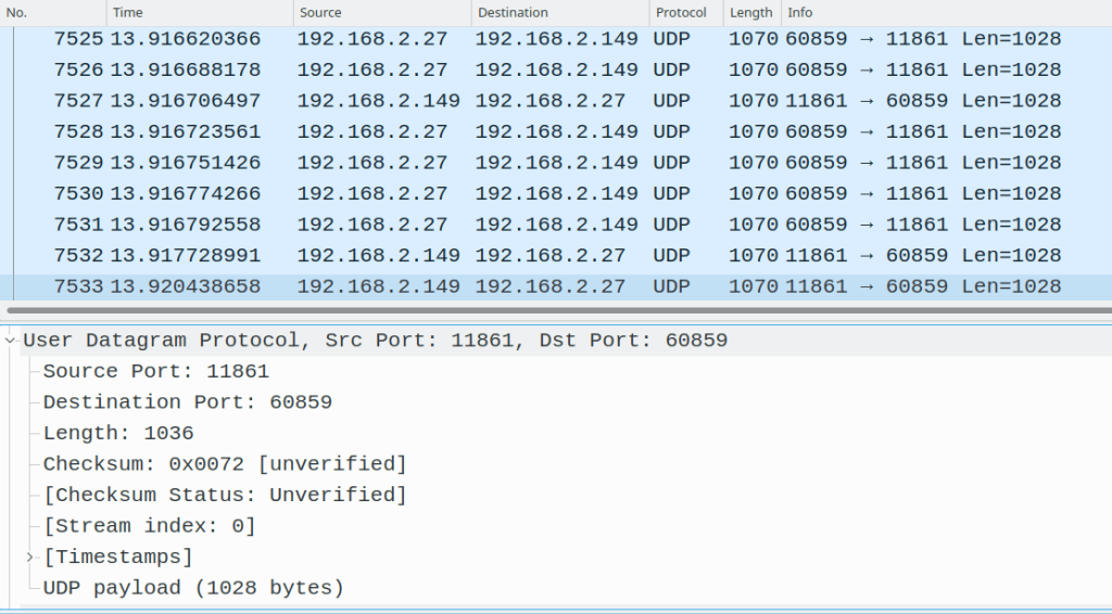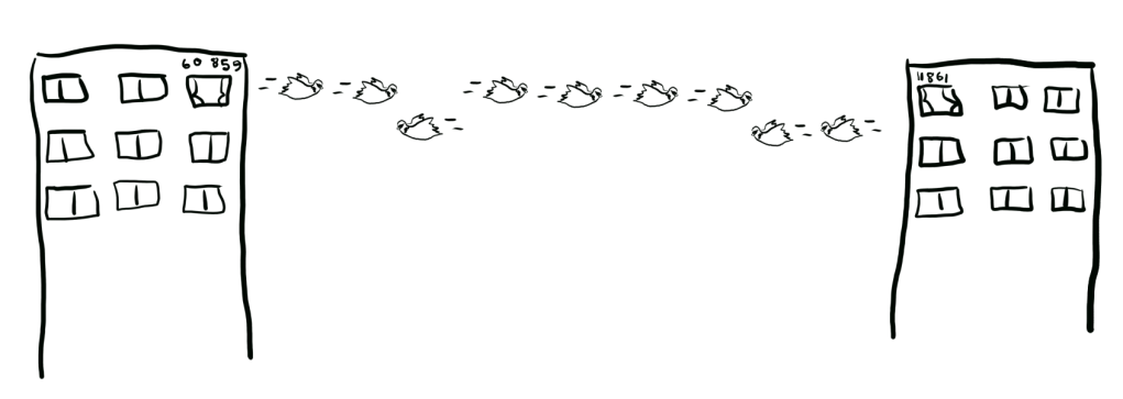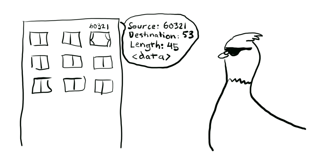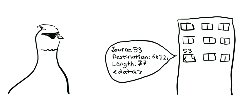 Let us begin with a new term: UDP “packets” are not called packets, but they are called datagrams, so we will use that from here on. Unlike with TCP, UDP does not have a concept of a connection. There is no beginning or end. But similar to TCP packets, UDP datagrams have source and destination ports. When one endpoint sends an UDP datagram to a second one, then the second endpoint can reply to it by sending an UDP datagram back to the port which the first endpoint sent its packet from. Again, you can visualise the two computers as apartment buildings: the pigeon needs to know which window to deliver the message to.
