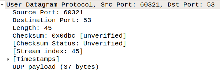 The UDP port 53 is registered for DNS, so that is the server’s UDP port the client sends its UDP packet to. The client selects 60321 as its source port. The size of the UDP datagram is 45 – this includes 8 bytes of the UDP headers, and 37 bytes of payload. The pigeon is sent on its way.