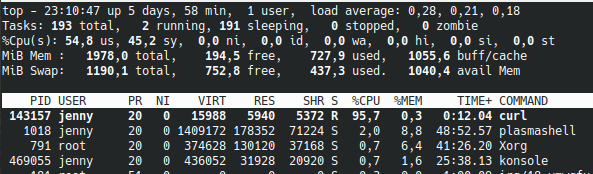 I got a few MQTT traffic samples and started the fuzzer. I left it running for the night. When I came back in the morning, I found my test stuck and curl eating close to 100% of my CPU.